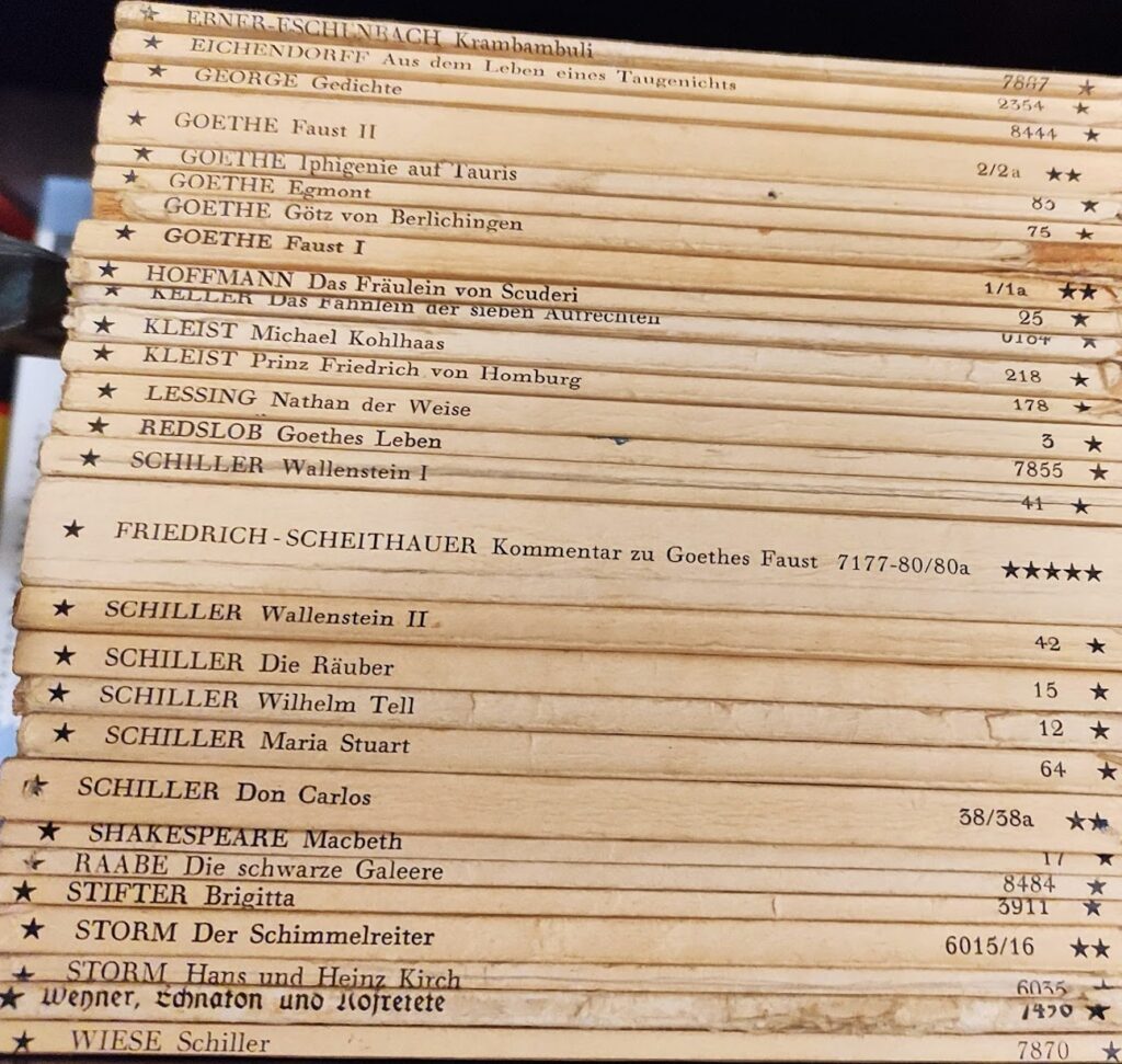 Unsere Deutschlehrerin Annemarie Tilger, liebevoll „Mutti“ genannt, brachte uns das Beste von Goethe und Schiller nahe, die Menschheitsparabel Faust war bei ihr von zentraler Bedeutung, aber auch Modernes: Wolfgang Borchert’s „Nachts schlafen die Ratten doch“ war berührend.