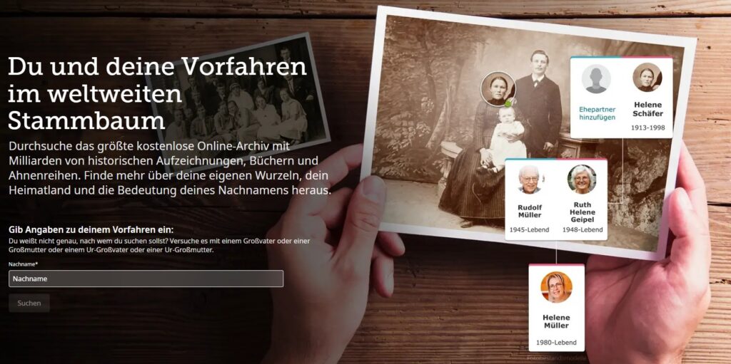 ancestry, USA, >60 Mrd. Datensätze, teilweise kostenpflichtig. Sammlung digitalisierter genealogischer Originaldokumente, DNA-Datenbank, weltweit. >>> ancestry