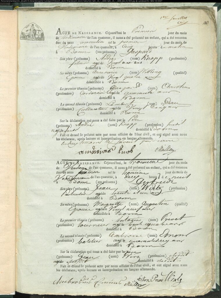 Zwei Geburtsanzeigen im Jahr 14 (nach dem franz. Revolutionskalender) aus Bonn 1803: Gaspard Knopp und Gertrude Wirtz