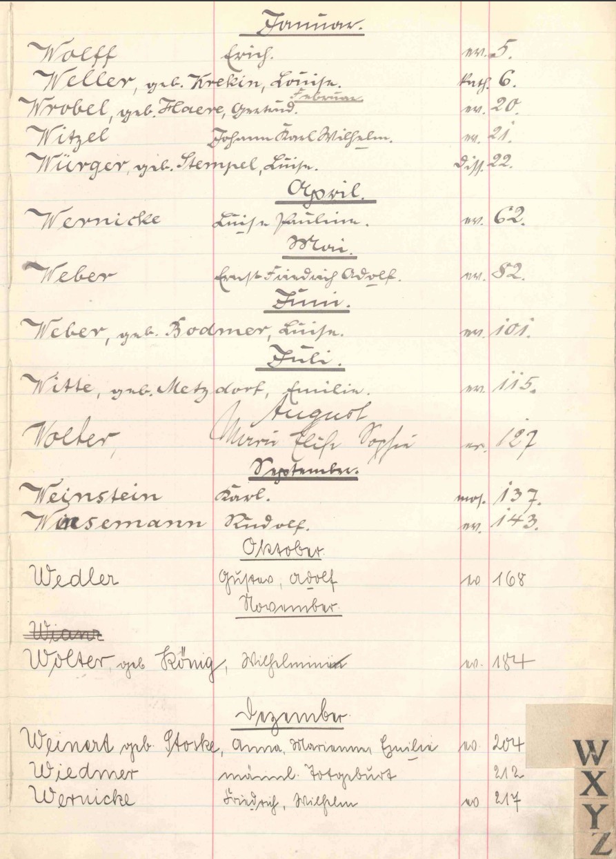 Die nachfolgenden Register sind alphabetisch nach Familiennamen geordnet. In der ersten Spalte ist die fortlaufende Registernummer des Eintrags (18). Familienname (Heinen) und Vornamen (Anna Maria) sind gefolgt von Vornamen (Peter Anton) und Beruf (Zimmermann) des Vaters. Der Wohnort des Vaters Ockenheim ist abgekürzt durch (O). Mit (19) wird in das chronologisch geordnete Geburtsregister verwiesen, wo auch das Geburtsdatum notiert ist.