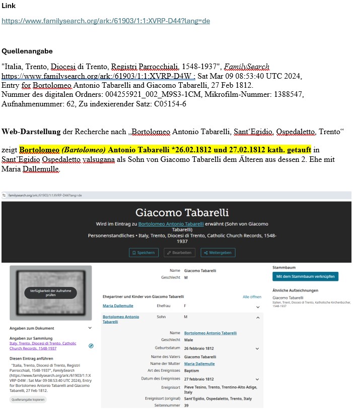 Bartolomeo Antonio Tabarelli kam am 26.02.1812 in Ospedaletto valsugana als Sohn von Giacomo Tabarelli dem Älteren *15.04.1773 zur Welt, der in 2. Ehe mit der am 5. April 1787 geborenen Maria Dallemulle – zur Zeit die früheste identifizierbare „Mutter“ vieler Tabarelli in Italien, Österreich und Deutschland – verheiratet war.