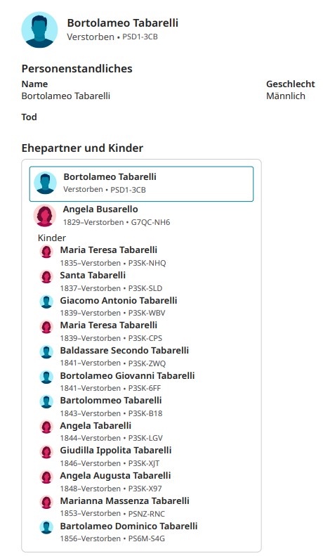 Bartolomeo Tabarelli hatte Nachkommen aus 2 Ehen. In 1. Ehe heiratete er am 10. Februar 1835 in Sant’Egidio in Ospedaletto valsugana seine 1. Frau Angela Lucia Busarello, geboren 04.09.1813 in Ospedaletto valsugana als Tochter von Antonio Busarello und Teresa Ongaro.