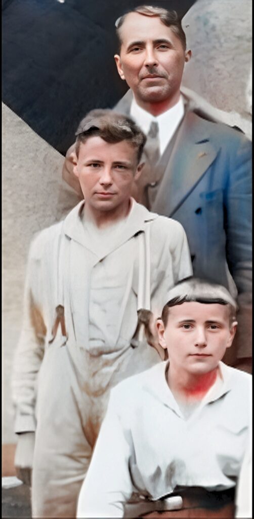 Der Bildausschnitt zeigt von links: Heinrich Tabarelli (15 Jahre), Lehrer Fritz Issinger, Friedel Tabarelli (13 Jahre).