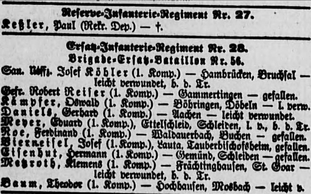 Clemens war mit seinem Reserve-Infanterie-Regiment Nr.28 Brigade-Ersatz-Bataillon Nr.56 an der Westfront eingesetzt und ist in den Gefallenenlisten (2 Mio. tote deutsche Soldaten) 1915 als leicht verwundet zwischen 4 Gefallenen aufgeführt. Sein Geburts-Wohnort ist durch einen Hörfehler mit Frächtingshausen verfälscht.