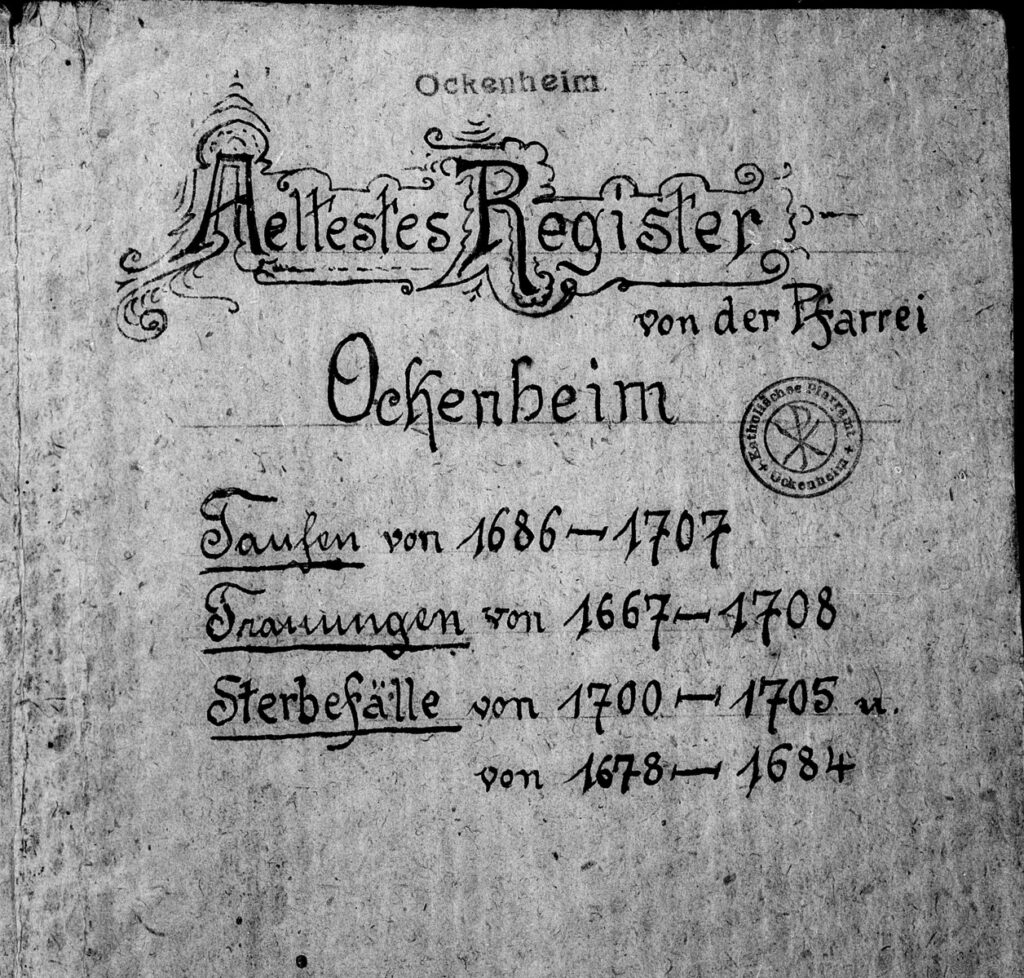 Im Familienarchiv Weinheimer-Ockenheim liegen 4 digitalisierte Kirchenbücher der Kath. Pfarrei St. Peter & Paul Ockenheim 1667-1885 vor, die über 220 Jahre zum Lebenskreislauf Geburt & Taufe, Firmung, Hochzeit & Ehe sowie Tod & Beerdigung in Ockenheim informieren.