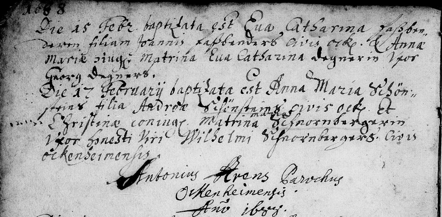 Transkription: 1688 – Die 15 Febr. baptiztata est Eva Catharina Faßbender filiam Joannis Faßbender civis Ock. et Anna Mariae sing. Matrina Eva Catharina Degnerin uxor Georg Degner. – Die 17 Februarii baptizata est Anna Maria Schönstein filia Andreae Schönstein civis Ock et Christinae coninge Matrina Schnorrenbergerin uxor honest viri Wilhelmi Schnorrenberger Civis Ockenheimensis. Antonius Arens Parochus Ockenheimensis. Anno 1688 ib…?