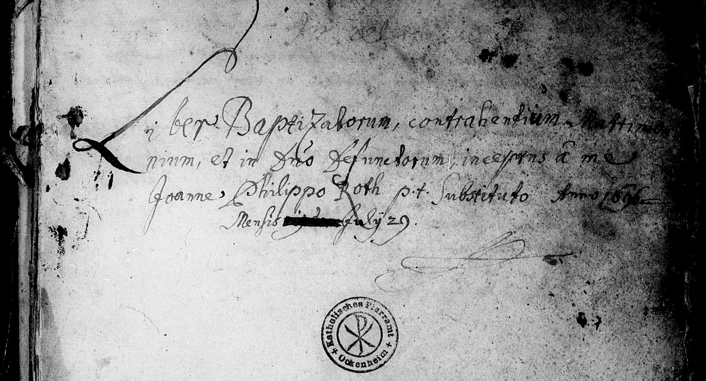Transkription: Liber Baptizatorum, contrahendium Matrimonium, et in pie Defunctorum, inceptus a me Joanne Philippo Roth p. t. substituto anno 1696 mensis July