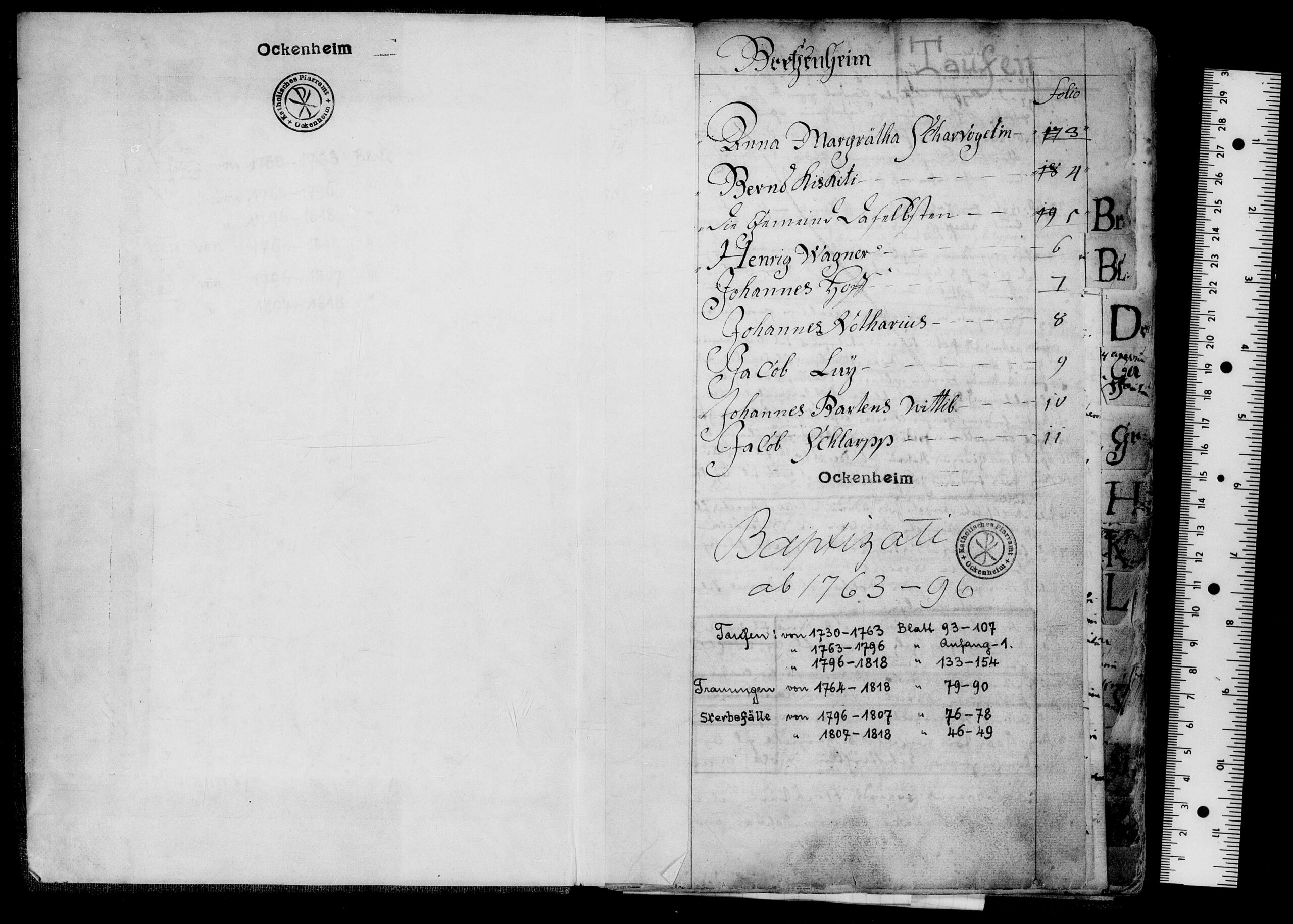- Rechts: Kb Ock 1818-1885 Buchtitelblatt: Matricula Ockenheimensis Liber Baptizatorum, Confirmatorum, Matrimonio, Defunctorum, digital.f348