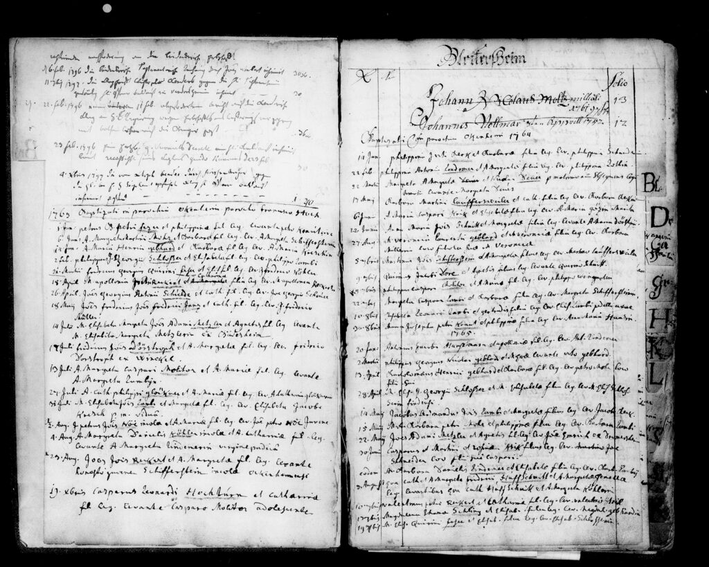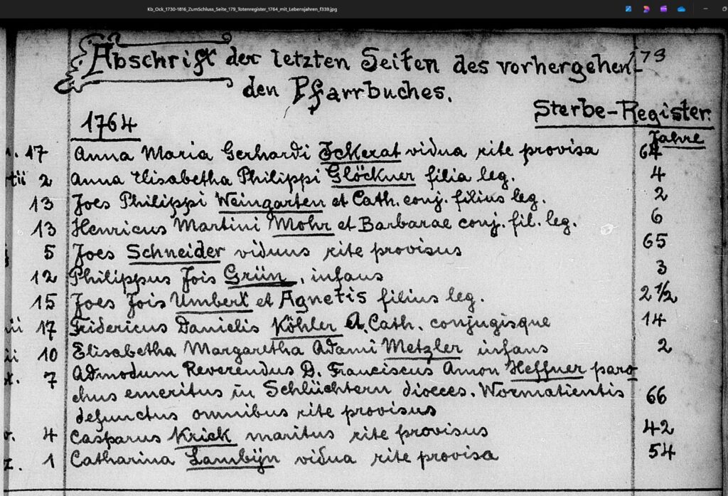 Am Ende des 3. Kirchenbuchs Ockenheim 1730-1816 hat der Verfasser das Sterberegister 1764 tabellarisch mit Lebensalter gelistet, was tiefe Einblicke zur Lebenserwartung 1764 und damals ungleichen Anteilen verstorbener Kinder / Erwachsener gibt. Ganz links wurde bei der Digitalisierung der Monat des Sterbetages nicht mit fotografiert (…rtii 2= martii 2= 2. März), nur der Sterbetag.