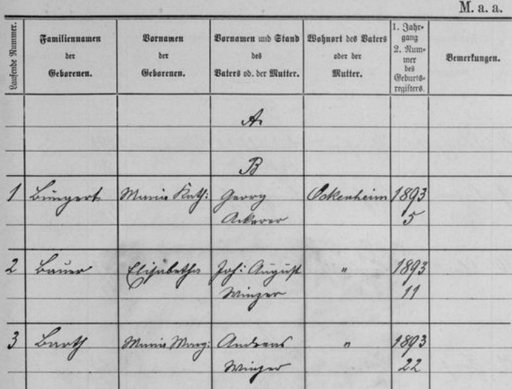am 19.08.1893 in Ockenheim geboren und katholisch getauft. Im Zivilstandsregister Ockenheim ist die Geburt von Maria Margaretha Barth mit Vater Andreas Barth, Beruf Winzer, 1893 unter No.3 angezeigt.