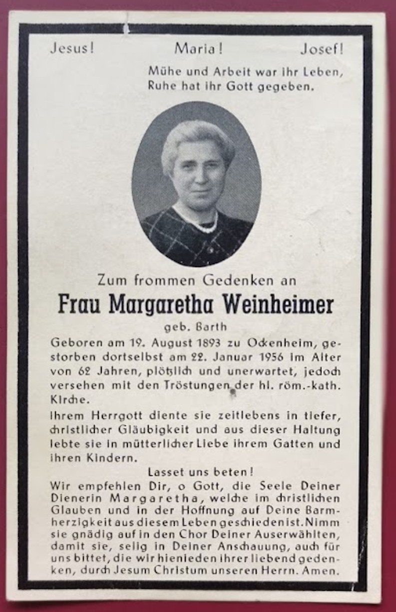 Maria Margaretha Barth vh. Weinheimer verstarb am 22.01.1956 plötzlich und unerwartet mit 62 Jahren in Ockenheim und wurde dort begraben.