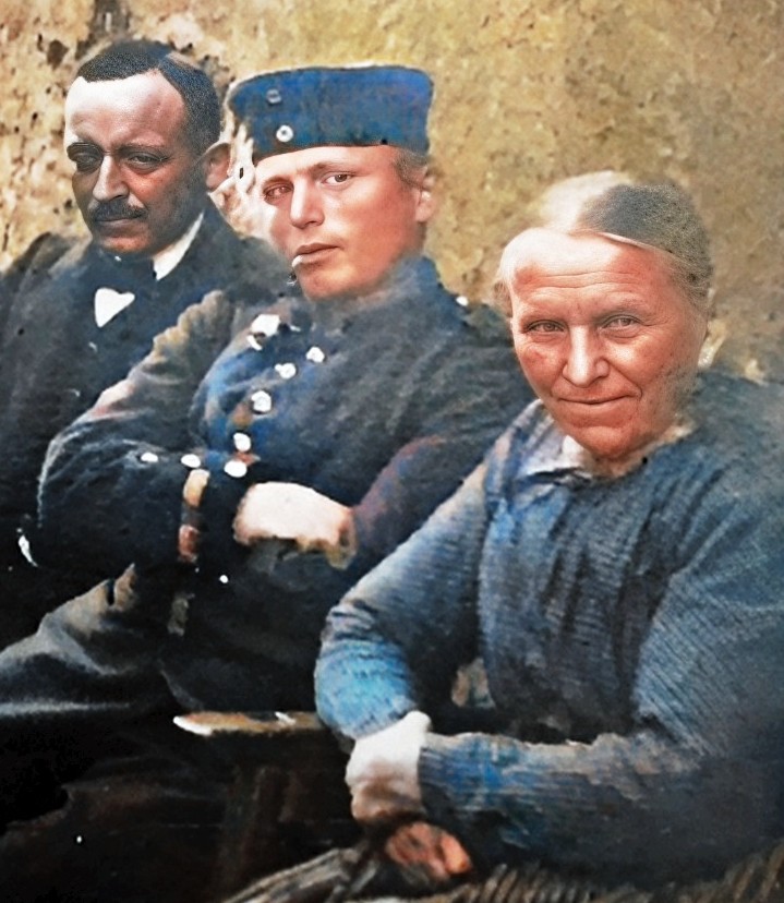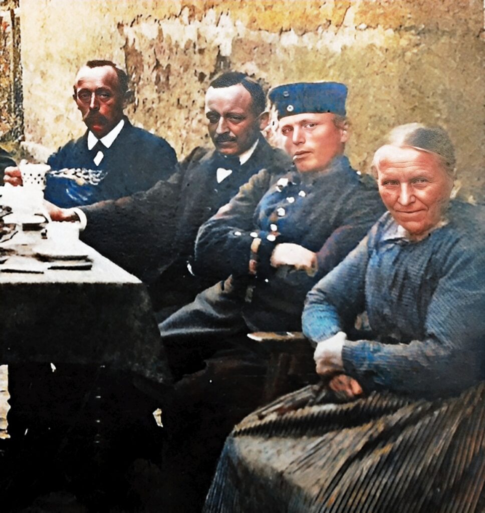 Ca. 1914 war er mit 20 Jahren während WK1 als Rekrut von der Militärausbildung mit 4 Kameraden der Ausbildungskompanie in Hammelburg (im nächsten Foto links am Tisch) auf Urlaub zuhause in Oberheimbach: Nikolaus Weinheimer (rechts im Bild) neben seiner Mutter Margaretha Oppermann vh. Weinheimer.