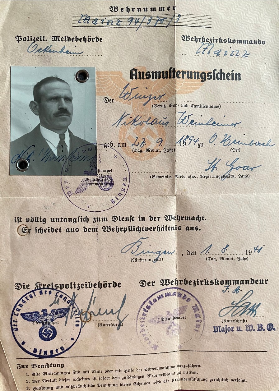 Da sein 1. Sohn Philipp *1921 noch minderjährig 1939 nicht eingezogen werden konnte, musste ihn Nikolaus an seiner Stelle bis 1941 bei der Wehrmacht „vertreten“. Danach erhielt Nikolaus mit Einzug von Philipp seinen Ausmusterungsschein.