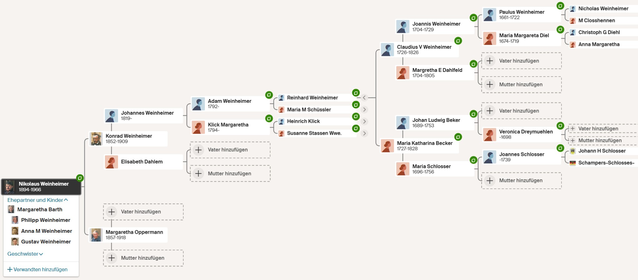 Ahnentafel Nikolaus Weinheimer mit 8 Vorfahren-Generation des Weinheimer-Zweigs. Foto: ancestry, Weinheimer-Stammbaum. Quelle: Kirchenbuch Kath. Pfarrgemeinde Oberheimbach. zVa
