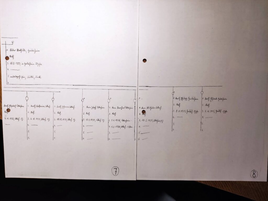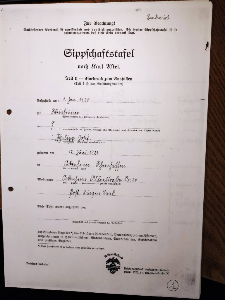 Der am 12.06.1921 in Ockenheim geborene Philipp Josef Weinheimer erstellte mit 16 1/2 Jahren am 01.01.1938 eine handschriftliche Sippschaftstafel in Sütterlin-Schrift mit seinen direkten Vorfahren, deren Geschwister als seine Onkel und Tanten, sowie deren Kinder als Cousins und Cousinen.