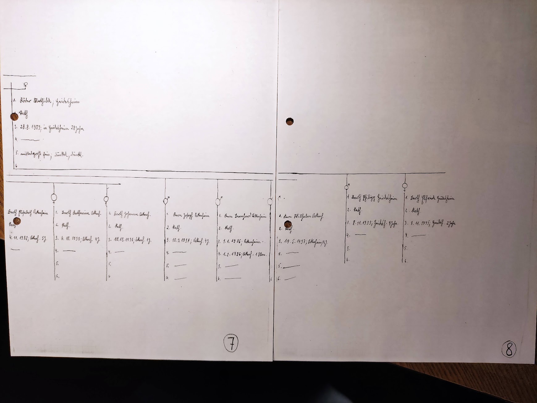Der am 12.06.1921 in Ockenheim geborene Philipp Josef Weinheimer erstellte mit 16 1/2 Jahren am 01.01.1938 eine handschriftliche Sippschaftstafel in Sütterlin-Schrift mit seinen direkten Vorfahren, deren Geschwister als seine Onkel und Tanten, sowie deren Kinder als Cousins und Cousinen.