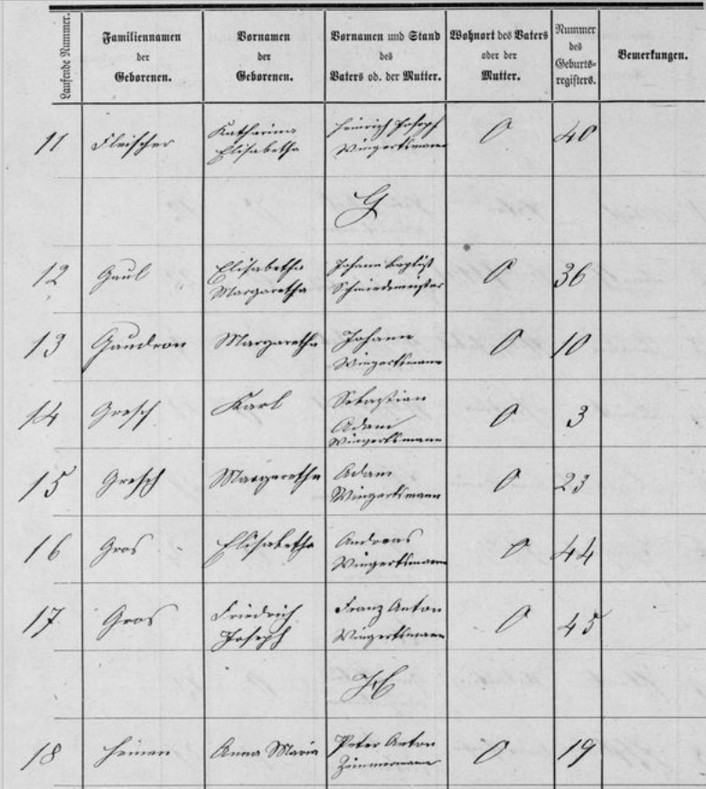 Auszug 1877 Geburten F-H, lfd.Nr. 11-18
