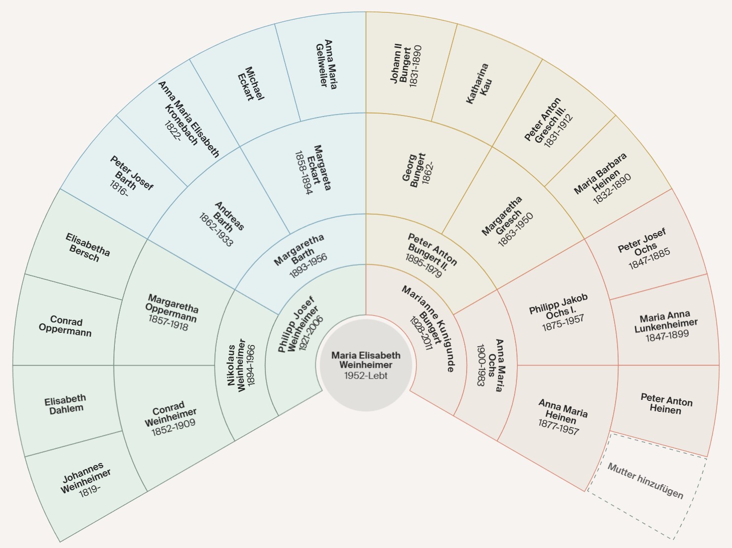Die Ahnentafel von Maria Elisabeth (Marliese) Weinheimer zeigt 4 Vorfahren-Generationen in Fächerform. zVa