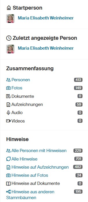 Der in ancestry manuell erfasste Weinheimer Stammbaum umfasst zur Zeit >400 Personen mit ihren Standesamtsdaten (Geburtsdatum und -ort, Hochzeitsdatum und -ort, Sterbedatum und -ort), sowie deren Personenbeziehungen wie Eltern – Kinder – Geschwister.