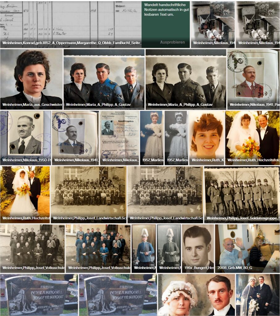 2. Durch Digitalisierung ausgewählter Teile des Papierarchivs entsteht eine multimediale Dokumenten- Foto- Audio-Datenbank mit digitalen Objekten .jpeg / .docx / .pdf / .mp3, in digitalen Verzeichnis-Strukturen geordnet nach Familien-Linien und darin nach Personen und Themen. Darin sind auch vertrauliche Informationen, die nicht publiziert werden. – – – Auch digitale Fundstücke aus Recherchen in externen Datenbanken, Genealogie-Portalen oder Archiven werden hier eingeordnet. Dieser private digitale Bestand wird auf portabler SSD harddisc *1) gespeichert und auf weiteren SSD harddiscs regelmäßig gesichert. Bestand 1.1.2026 ca. 800