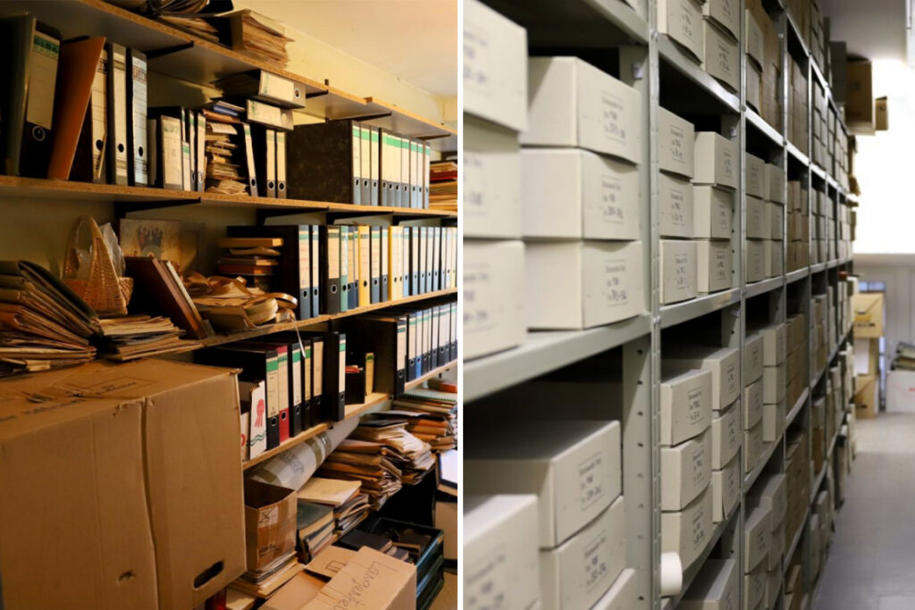 Innenraum Bistumsarchiv: ganz links: Ein Pfarrarchivbestand vom „Dachboden“, Mitte: verzeichnete und in säurefreie Archivschachteln eingelagerter Bestand, rechts: eine Findbuch Parade. Zur Vergrößerung anklicken.