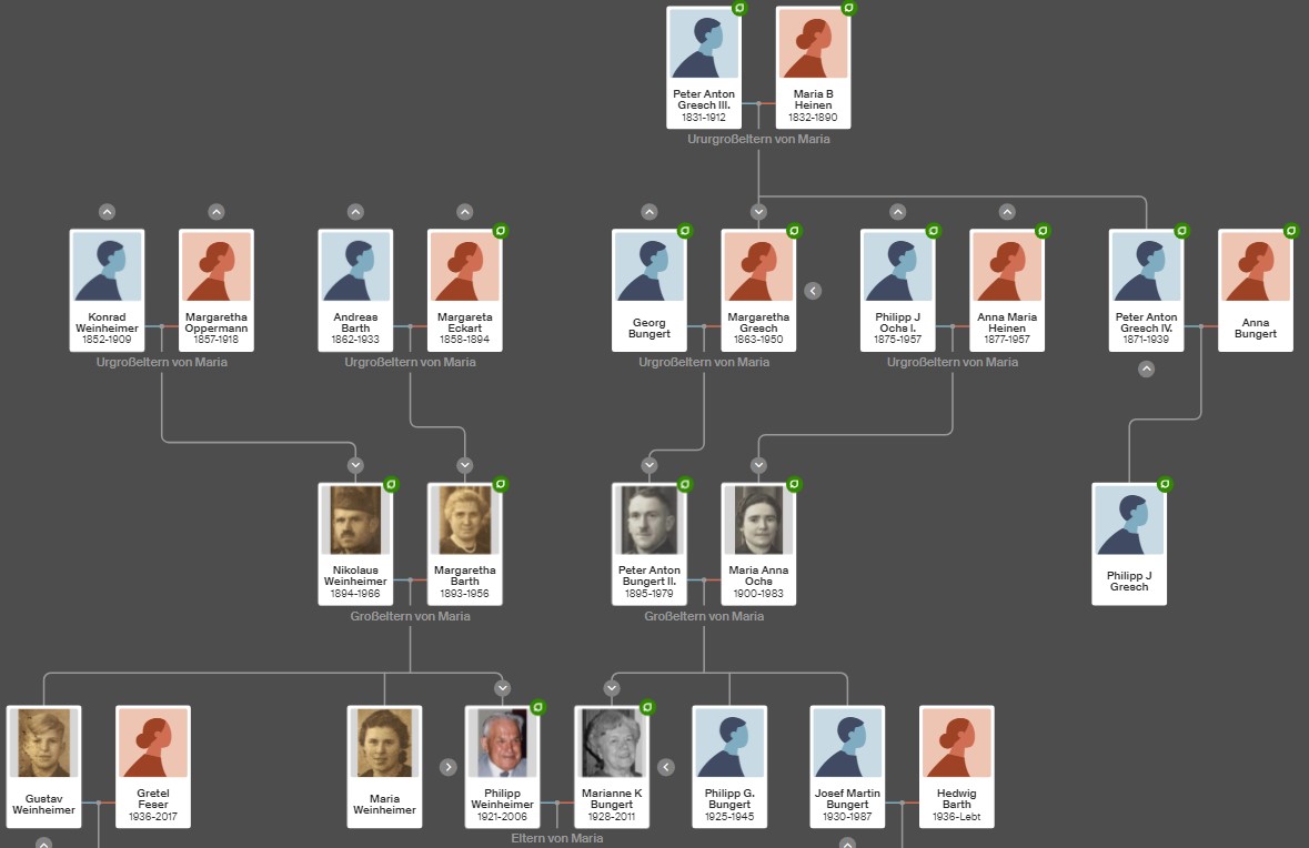 Über die eheliche Verbindung ihres Sohnes Philipp Weinheimer (1921-2006) mit Marianne Kunigunde Bungert (1928-2011) in St. Peter & Paul 1950 verbindet sich Weinheimer zu weiteren Ockenheimer Vorfahrenfamilien: Ochs, Gresch, Heinen, sowie Gaul, Kern und Lunkenheimer.