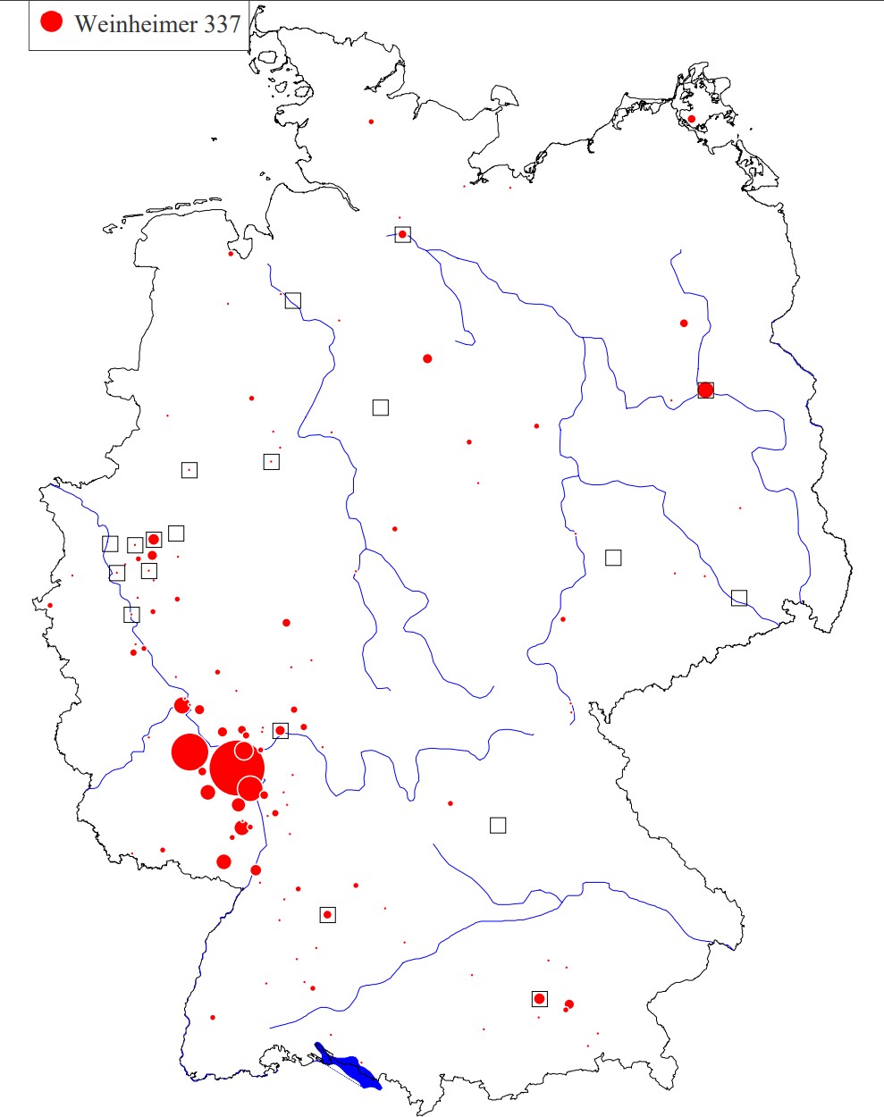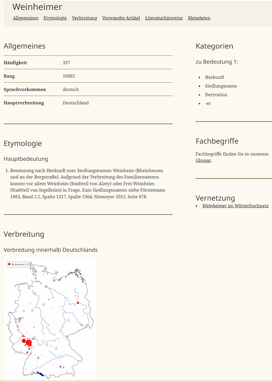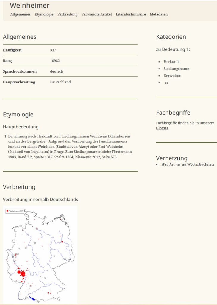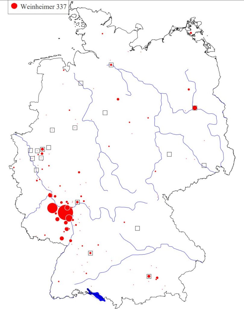 Der Familienname „Weinheimer“ ist in Deutschland weit verbreitet und besitzt in den Siedlungsräumen Rheinhessen und Bergstrasse Häufungsschwerpunkte. Das Portal „namensforschung.net“ weist am 01.12.25 in seiner Suchmaske 337 Personen mit Familienname „Weinheimer“ aus.