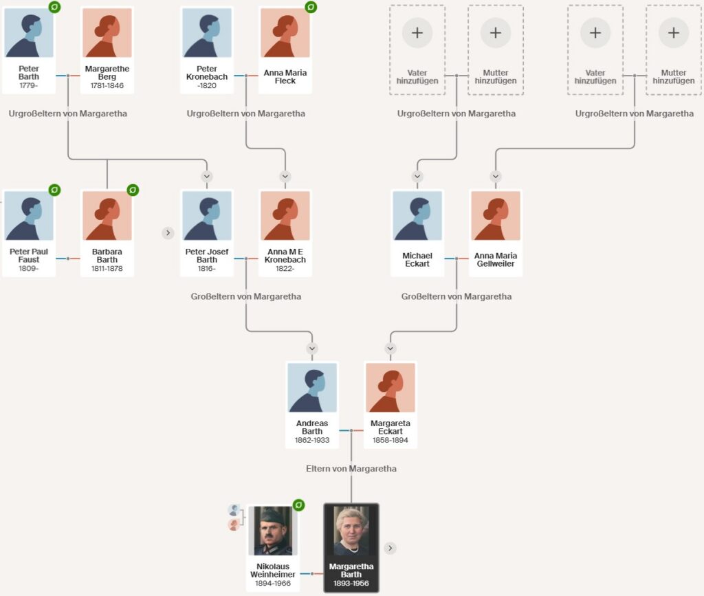 Die Sippschaftstafeln von Margaretha Barth vh. Weinheimer zeigen 2 Vorfahren- und 3 Nachkommen-Generationen. Vom Ausgangspunkt „Eheleute Nikolaus Weinheimer & Margarethe Barth vh. Weinheimer“ sind nach oben 2 Elternpaare und 4 Großelternpaare angezeigt.