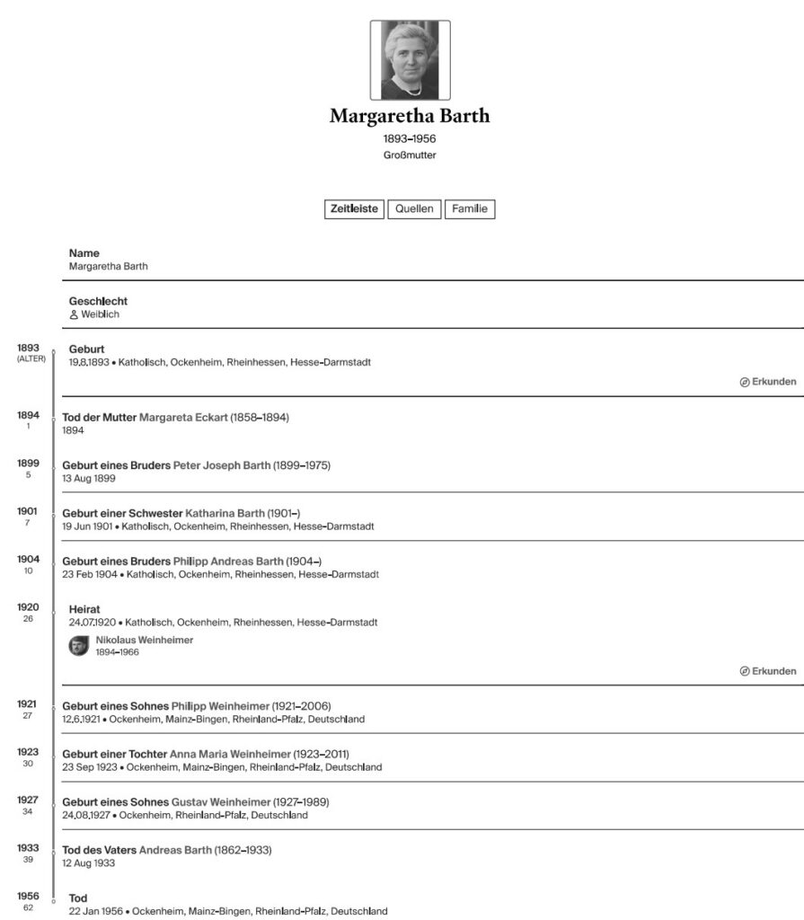Maria Margaretha Barth vh. Weinheimer verstarb am 22.01.1956 plötzlich und unerwartet mit 62 Jahren in Ockenheim und wurde dort begraben.