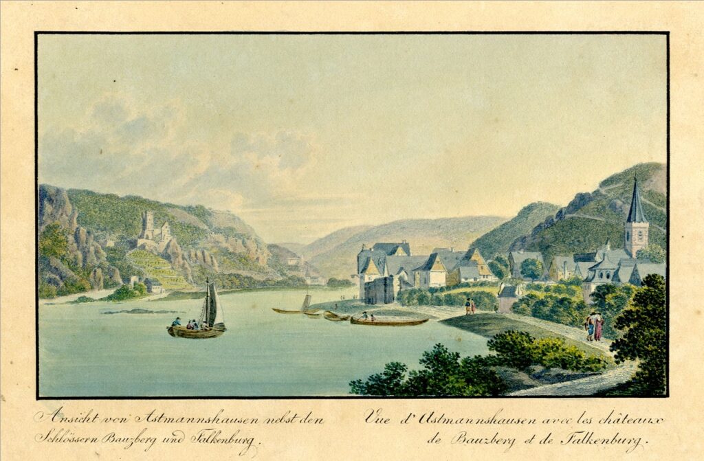 „Vue d‘ Astmannshausen avec les chateaux de Bauzberg et de Falkenburg“ zeigt vom rechtsrheinischen Aßmannshausen aus den Blick auf die linksrheinischen Ruinen der Fautsburg (heute Rheinstein), der Falkenburg (heute Reichenstein) und die St. Clemenskapelle, alle bei Trechtingshausen. Der französische? Künstler des Kupferstichs in der französischen Annexionsszeit ist unbekannt, das Werk ist auf Papier gedruckt und koloriert. Sein Standort: Goethemuseum, Freies Deutsches Hochstift Frankfurt am Main.